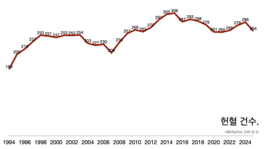 - 지난해 헌혈 인구는 284만 명, 전체 인구의 5.6%다.