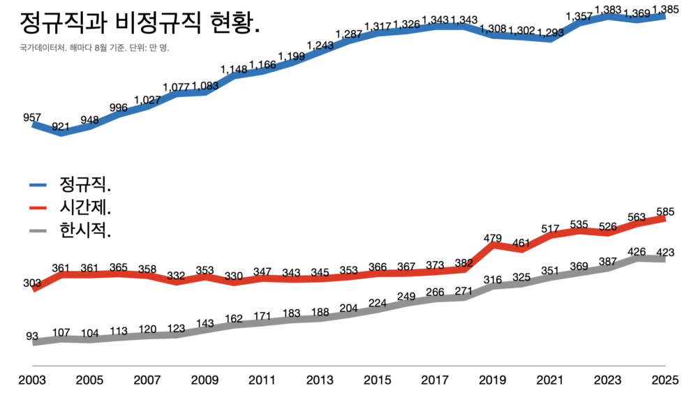 - 기간제 노동자 비율은 2010년 10%에서 2024년 12%로 늘었다.