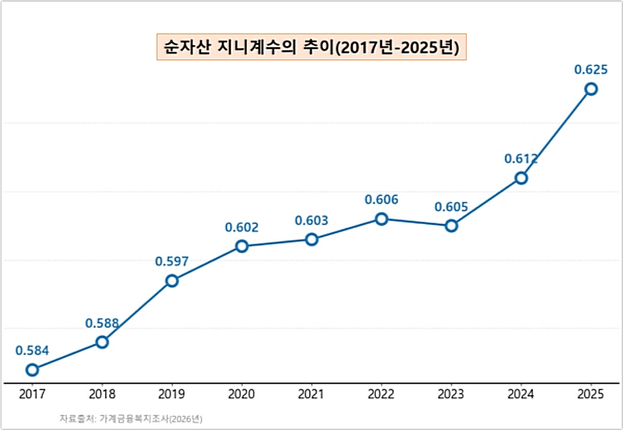 자산 불평등은 더 심각하다. 순자산 지니계수 역시 꾸준히 상승하고 있고, 최근 들어 그 폭은 더 커졌다. 소득 불평등이 완화되지 않는 가운데 자산 불평등까지 빠르게 확대되고 있다는 사실은, 한국 사회가 단순한 경기 국면이 아니라 구조적 양극화의 심화 국면에 들어섰음을 말해준다.