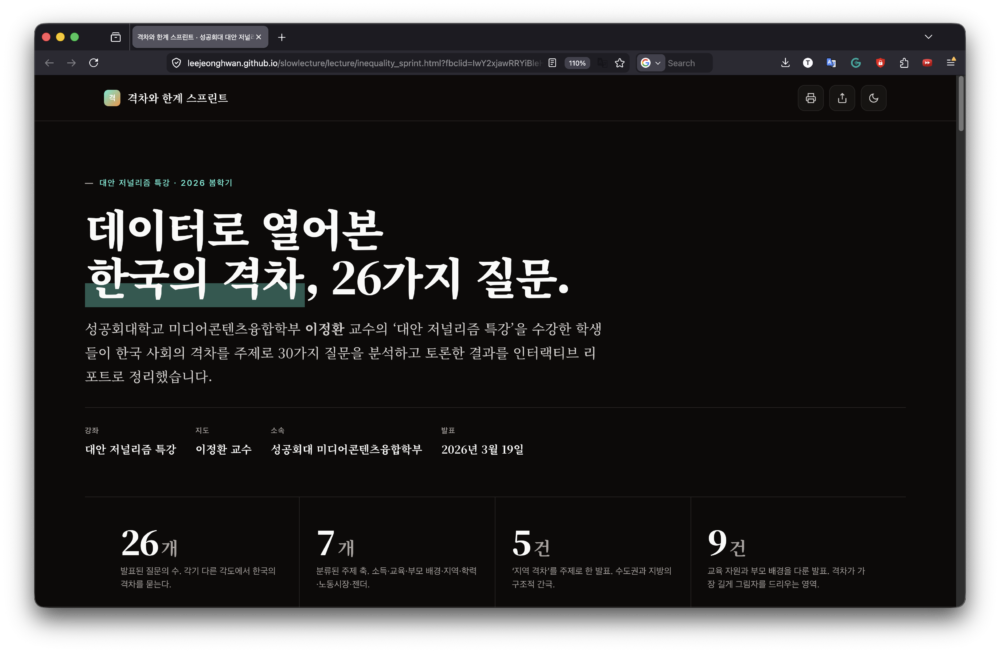 AI 시대의 대학 교육은 어떻게 달라져야 하는가. 이 리포트는 성공회대 미디어콘텐츠융합학부 겸임교수로 재직 중인 이정환 슬로우뉴스 대표가 진행하는 대안 저널리즘 특강의 실습 결과를 기초로 작성했다.