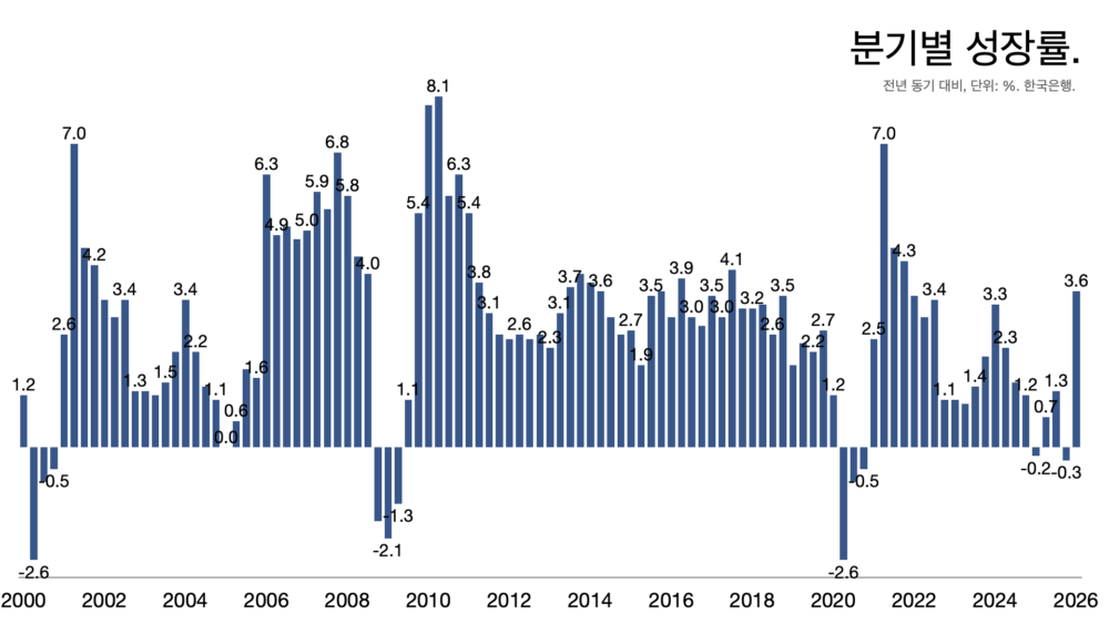 - 이동원(한국은행 경제통계국장)은 “반도체를 중심으로 수출이 증가하며 전체 성장을 강력하게 견인했다”고 설명했다. GDP 증가분 가운데 반도체 제조업이 차지하는 비율은 55%다.