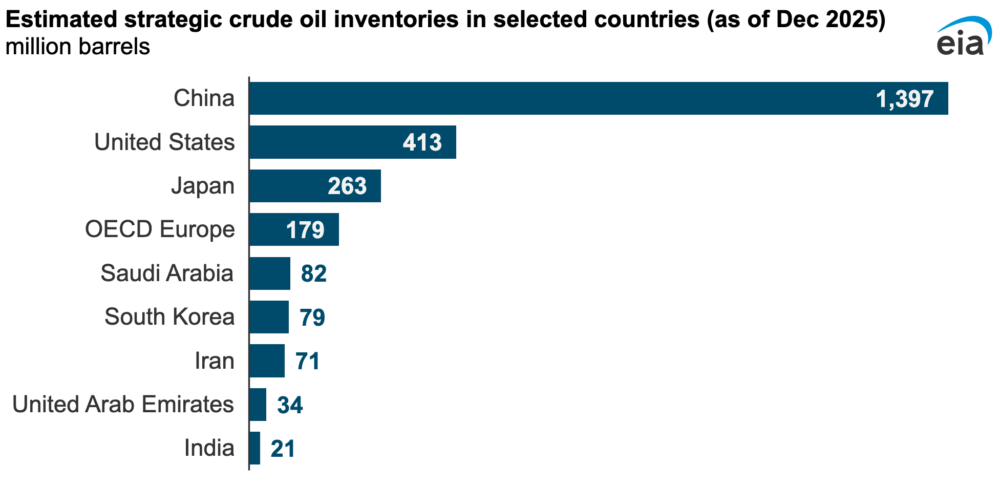 - 미국 에너지정보청(EIA) 분석이다. 지난해 12월 기준으로 중국의 석유 비축량이 13.9억 배럴에 이른다.