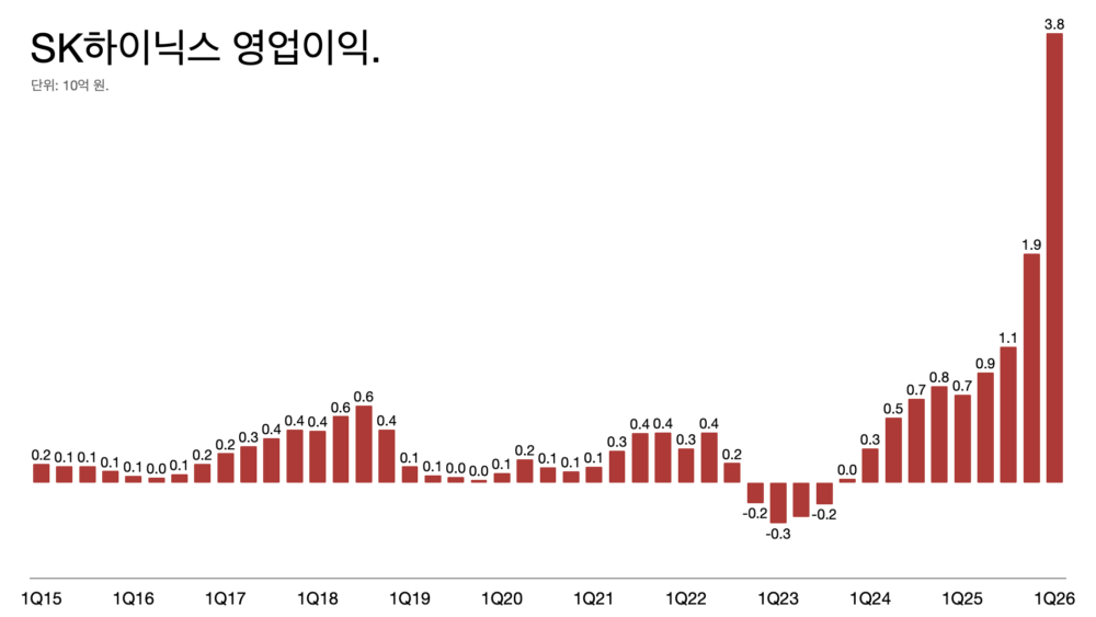 - SK하이닉스의 1분기 영업이익이 37.6조 원. 지난해 1분기와 비교하면 406% 늘었다. 매출액은 52.6조 원으로 198% 늘었다.