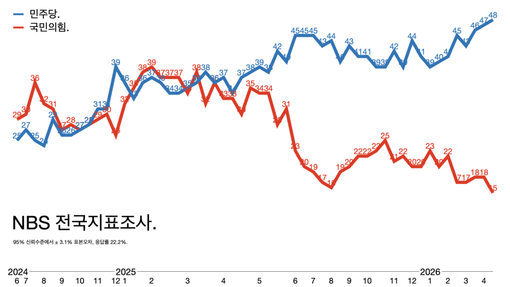 - 전국지표조사(NBS) 결과다. 민주당은 48%, 지지정당이 없다는 답변이 28%다.