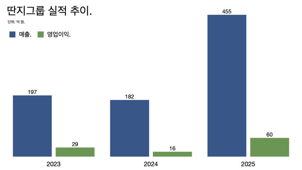 - 딴지그룹의 지난해 매출이 455억 원, 영업이익은 60억 원이다.