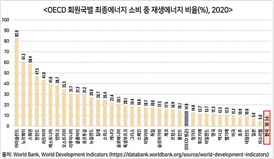 한국, OECD 꼴찌 수준의 재생에너지 비중